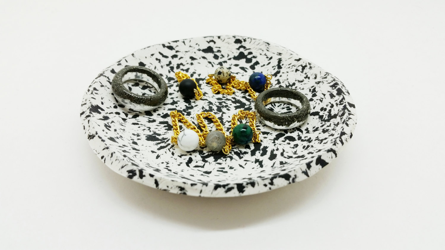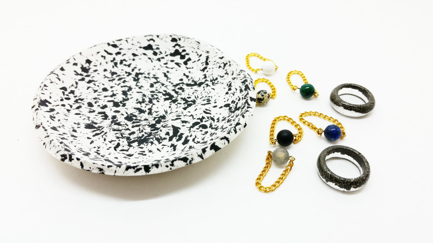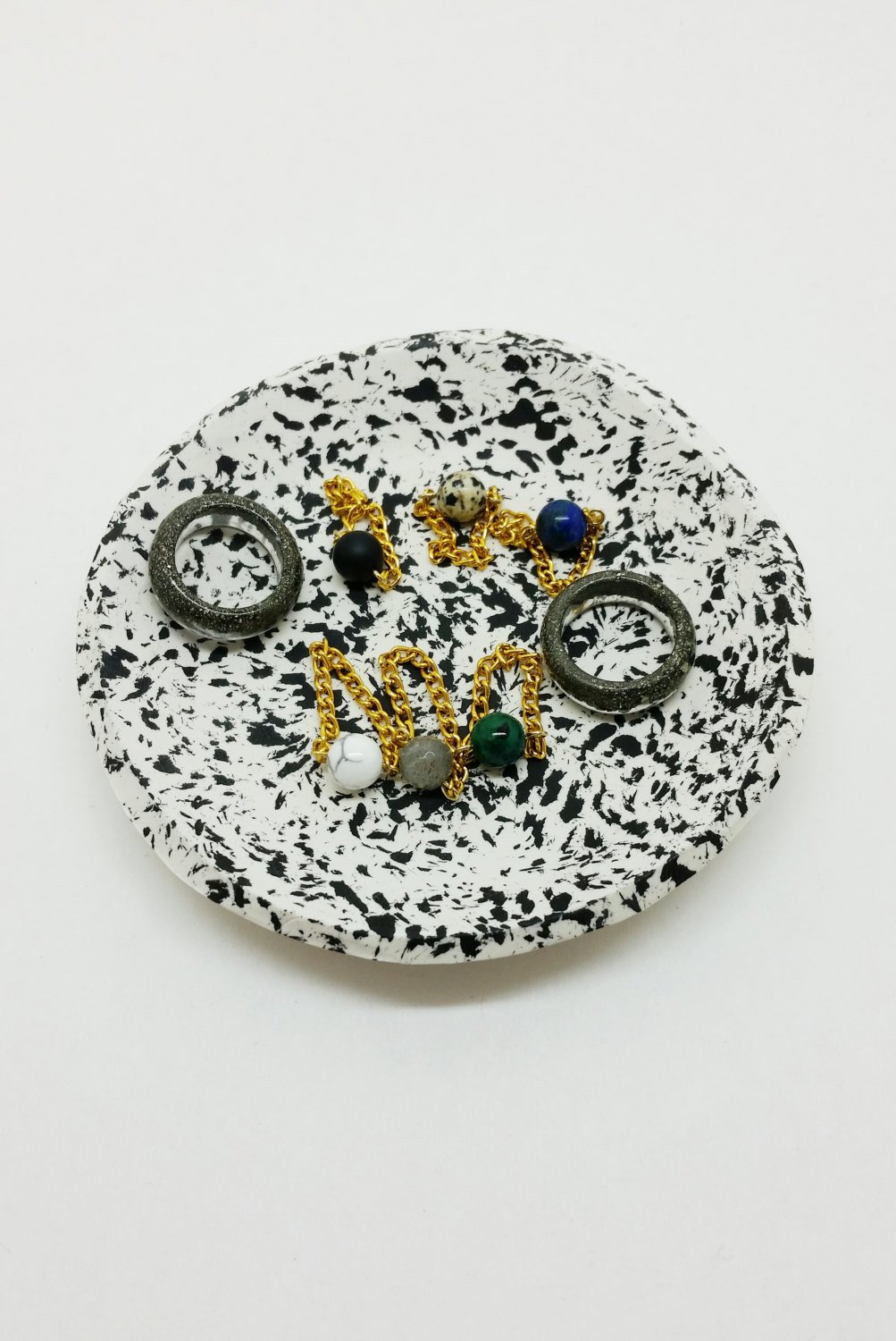 This speckled ring dish is the same pattern as my speckled half circle necklaces. The dish measures about 5 inches in diameter, and serves as both storage and decoration!