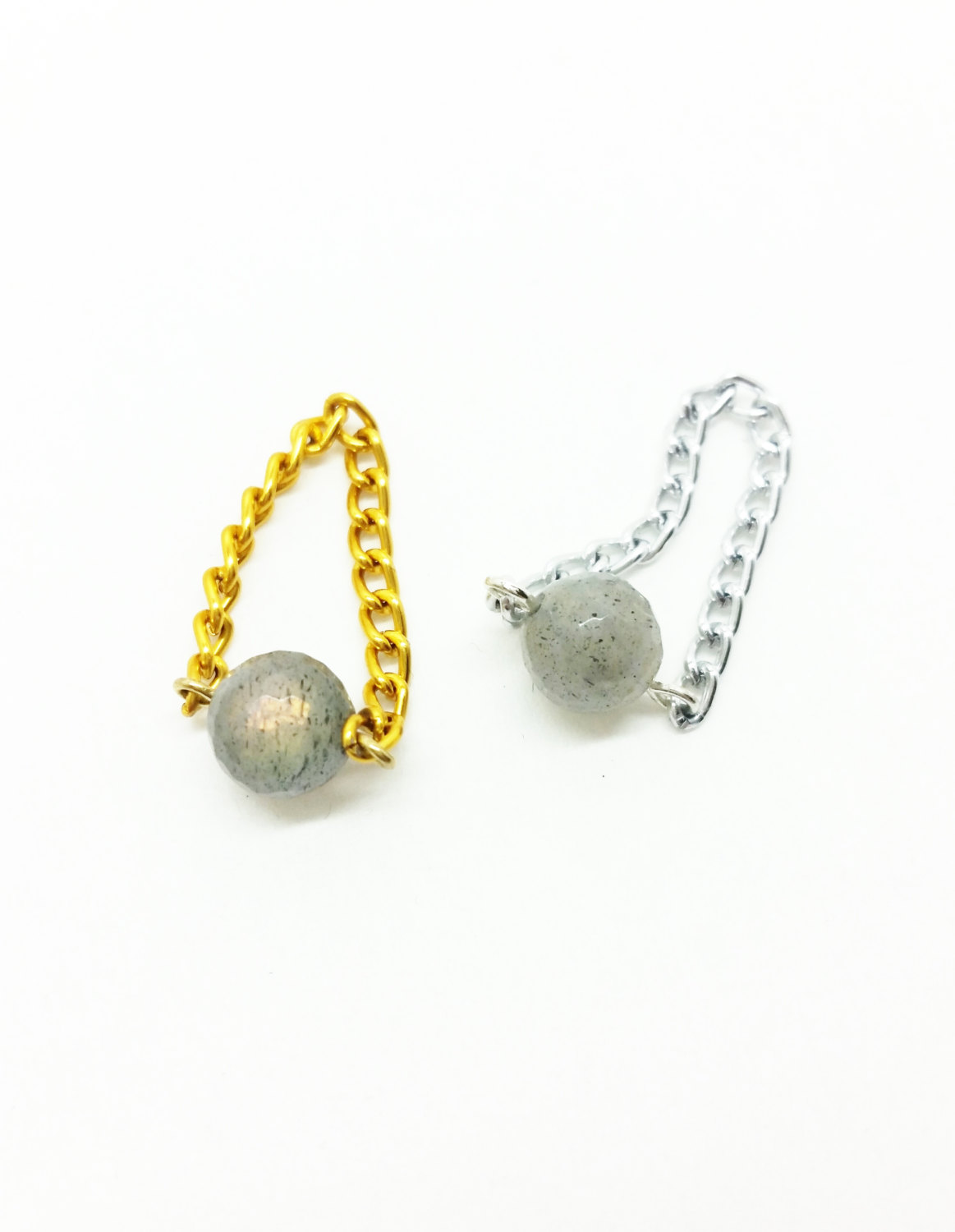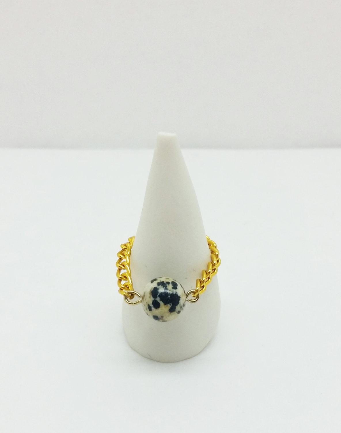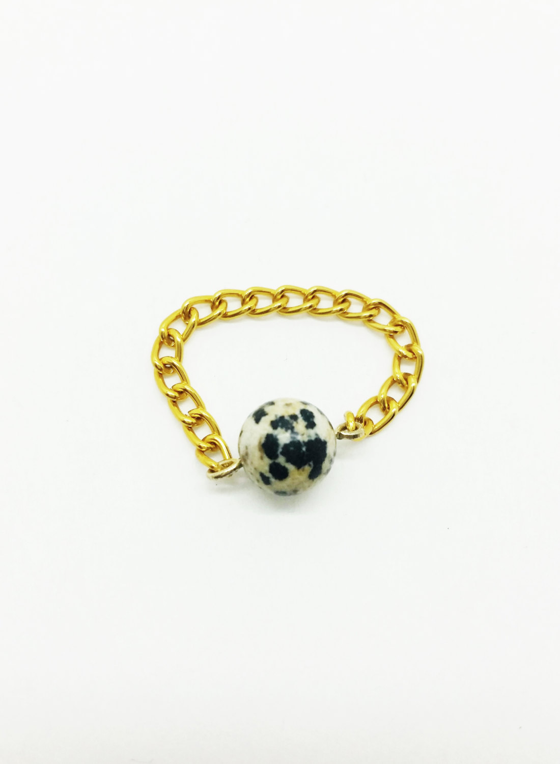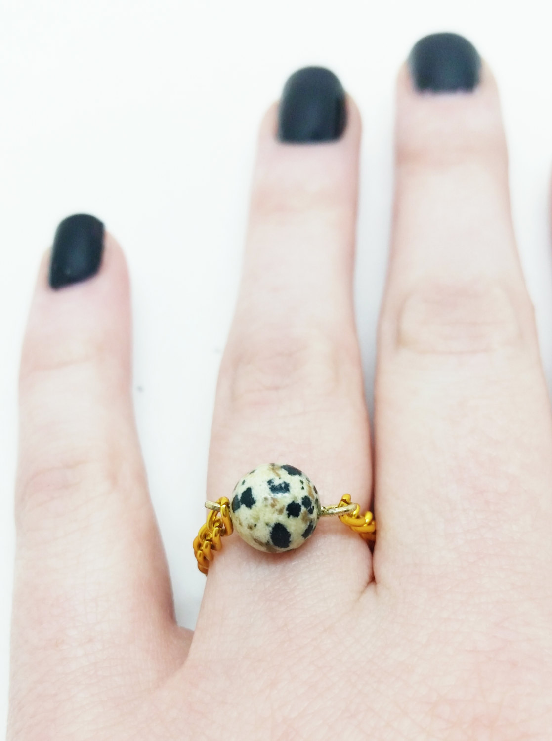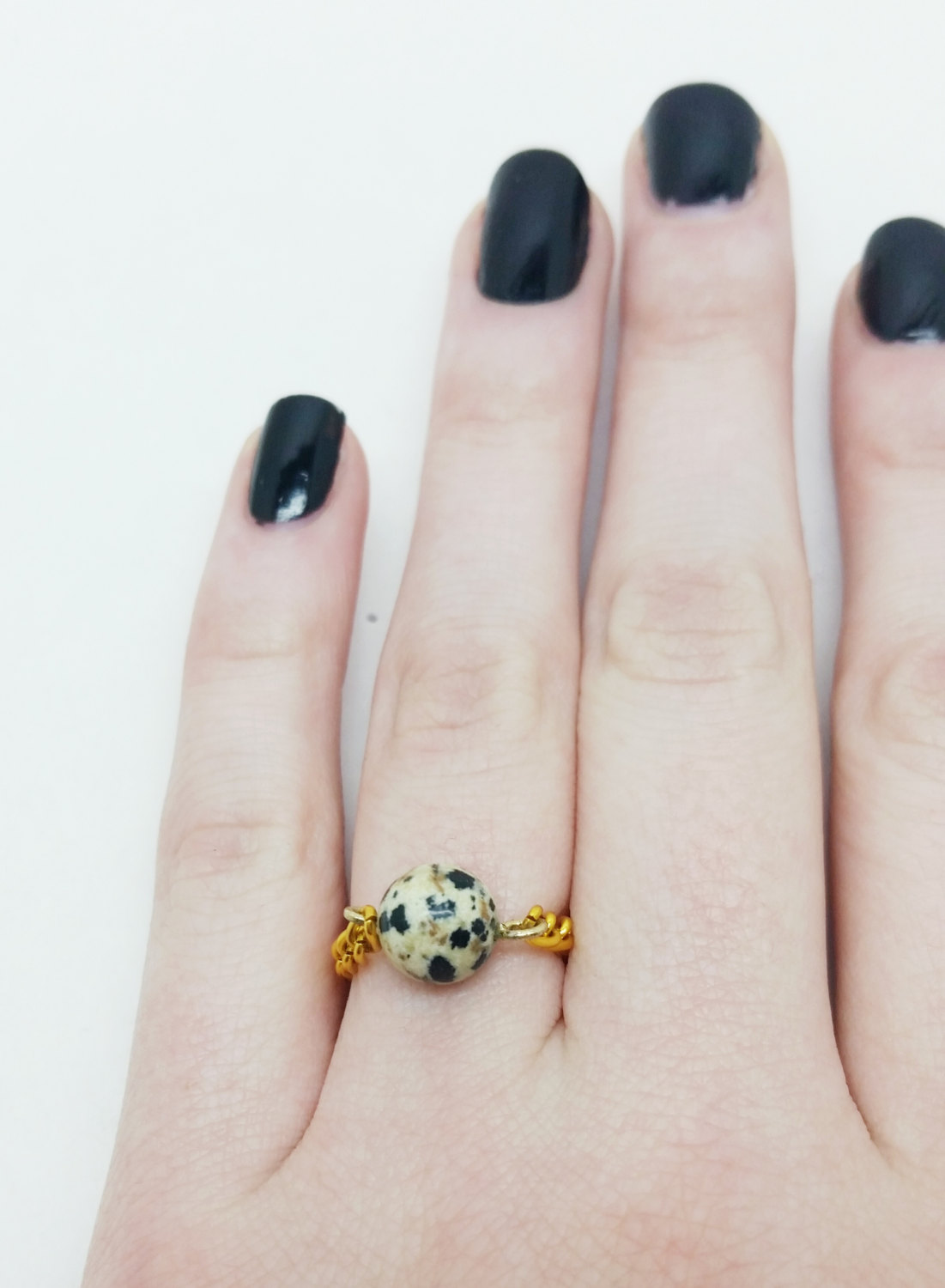 These beautifully simple rings are made with natural dalmatian jasper and a chain band. They are lightweight and never get in the way. I usually wear many of these gemstone rings at a time!