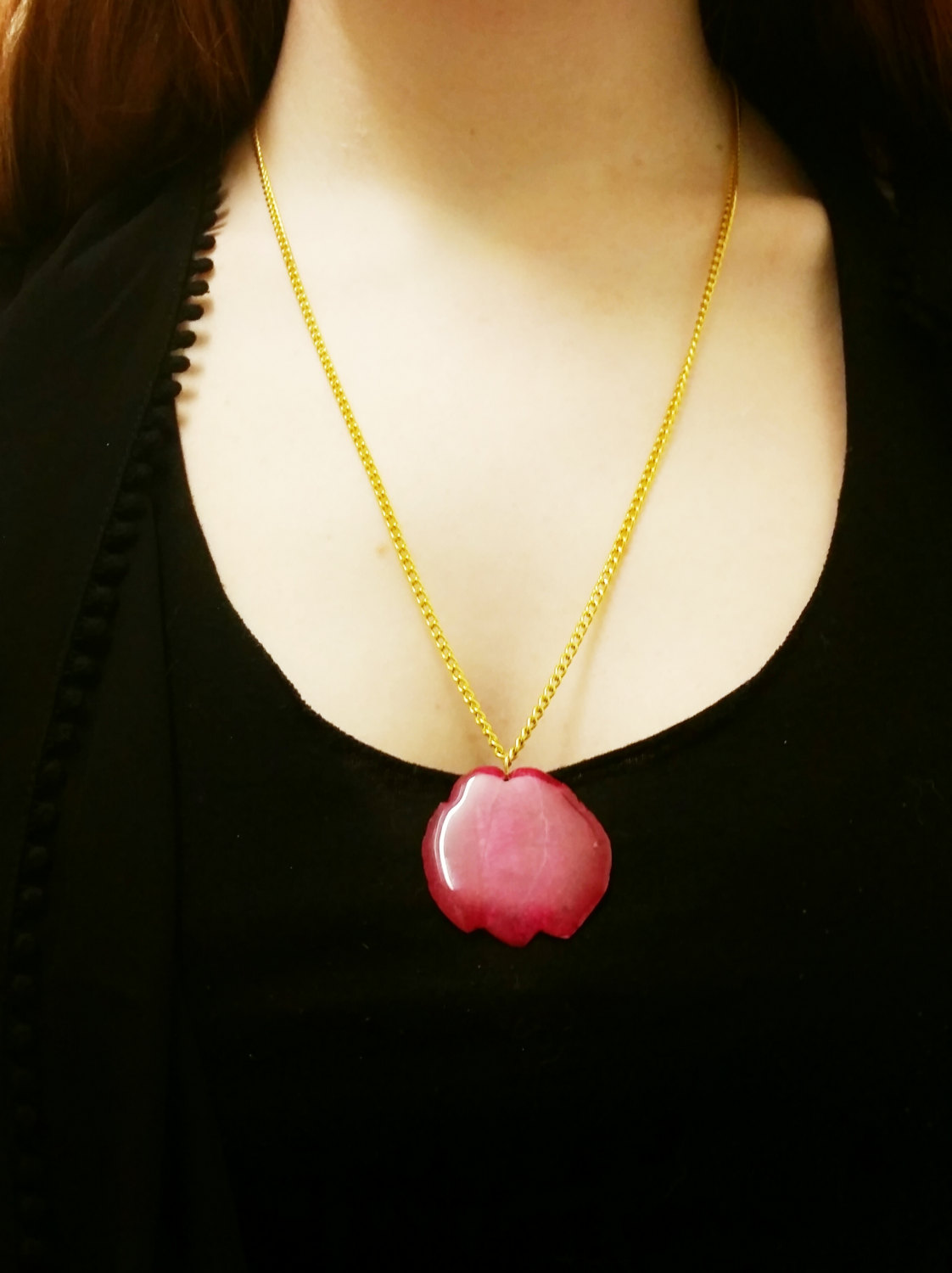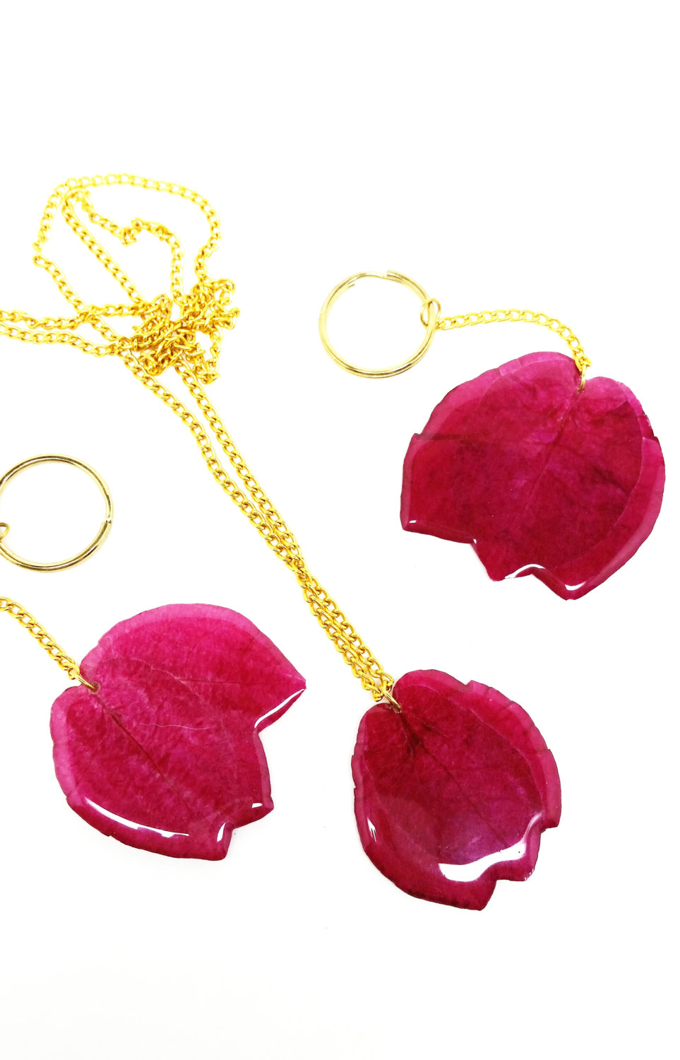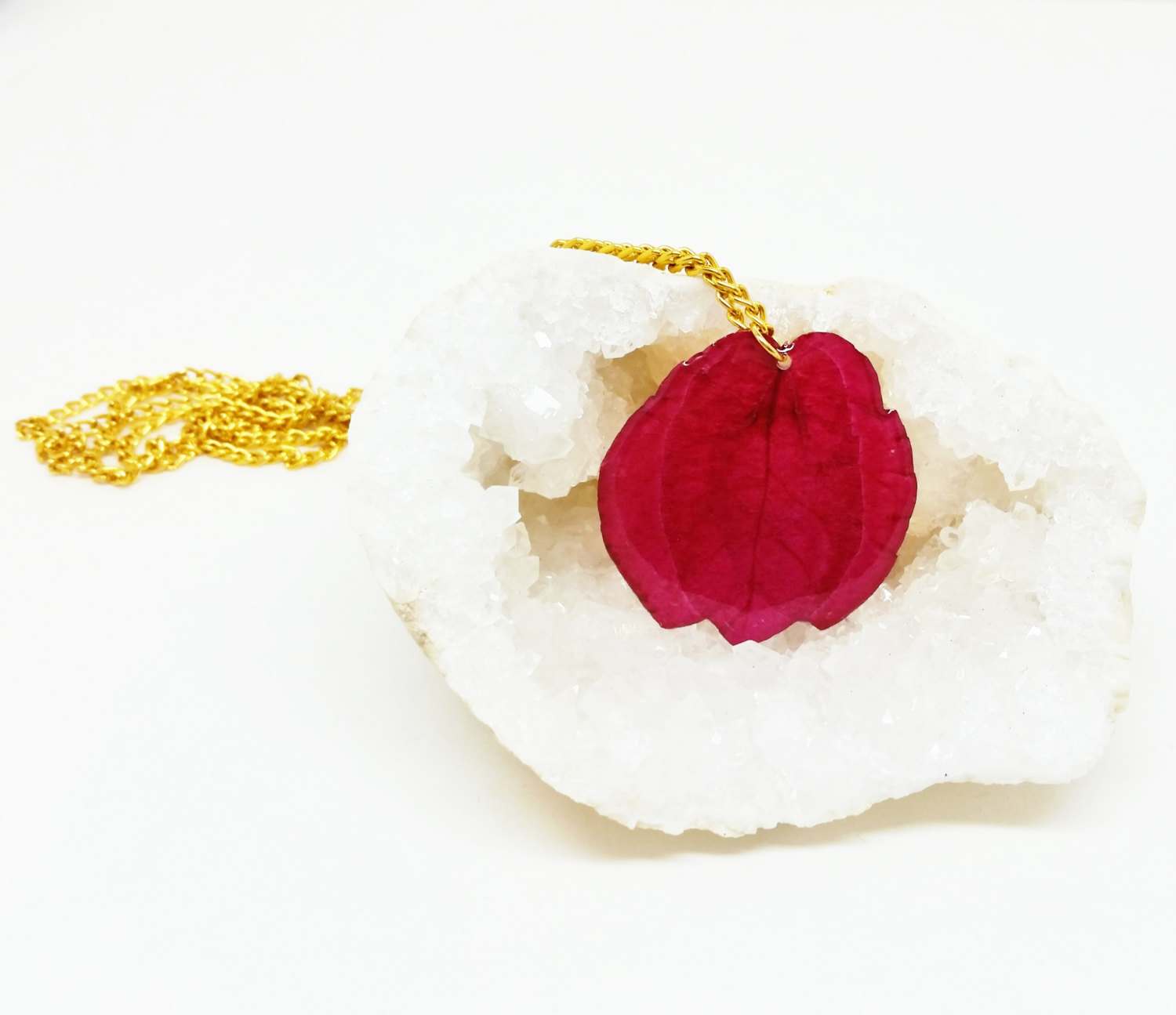 This necklace is made of a real pressed bougainvillea flower, preserved in resin and hung on either a gold or silver chain. The flower has a beautiful deep pink color, and will measure around 1-1.5 inches wide.