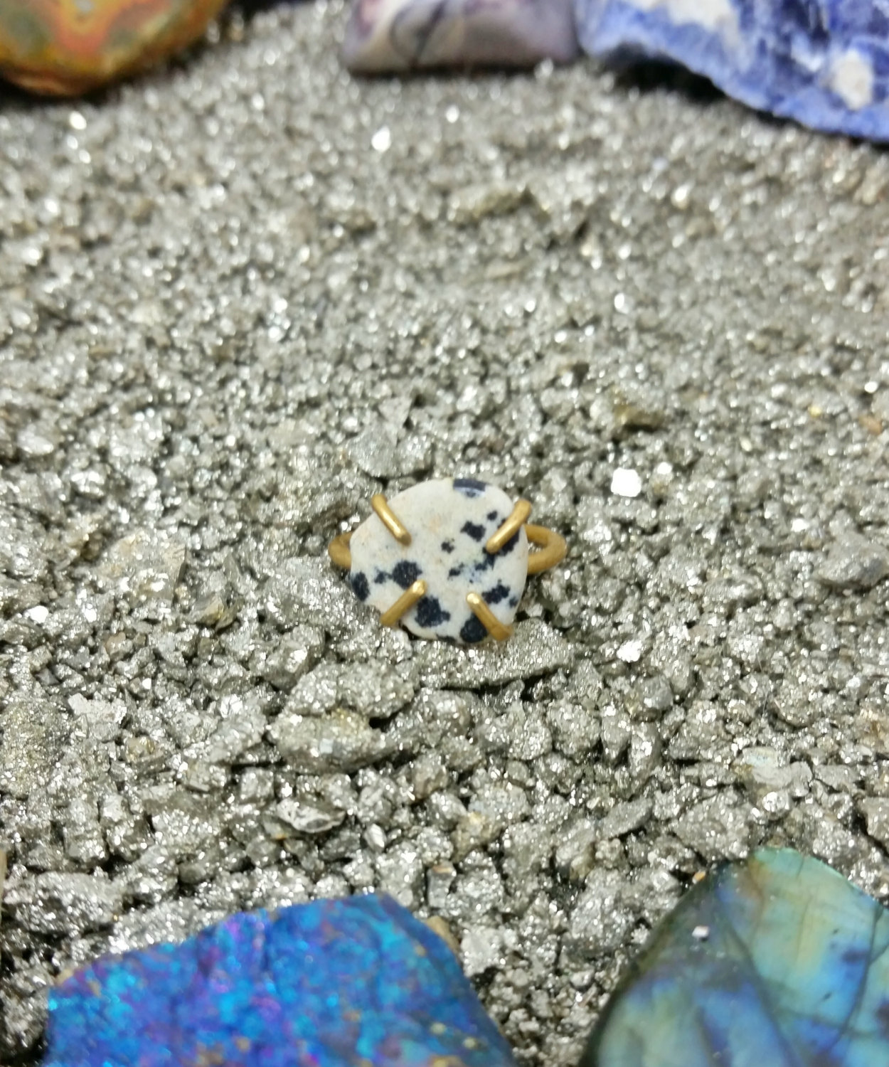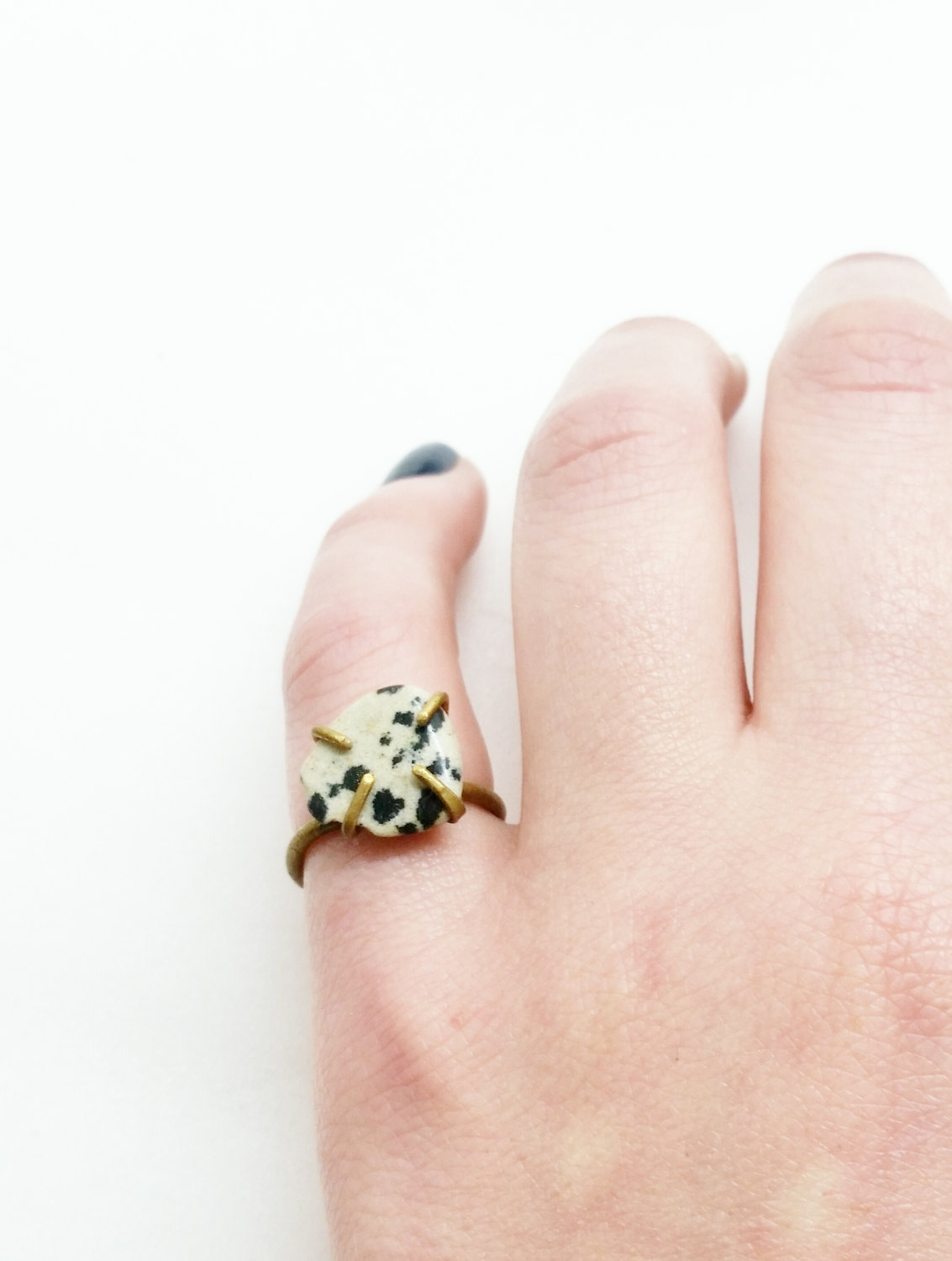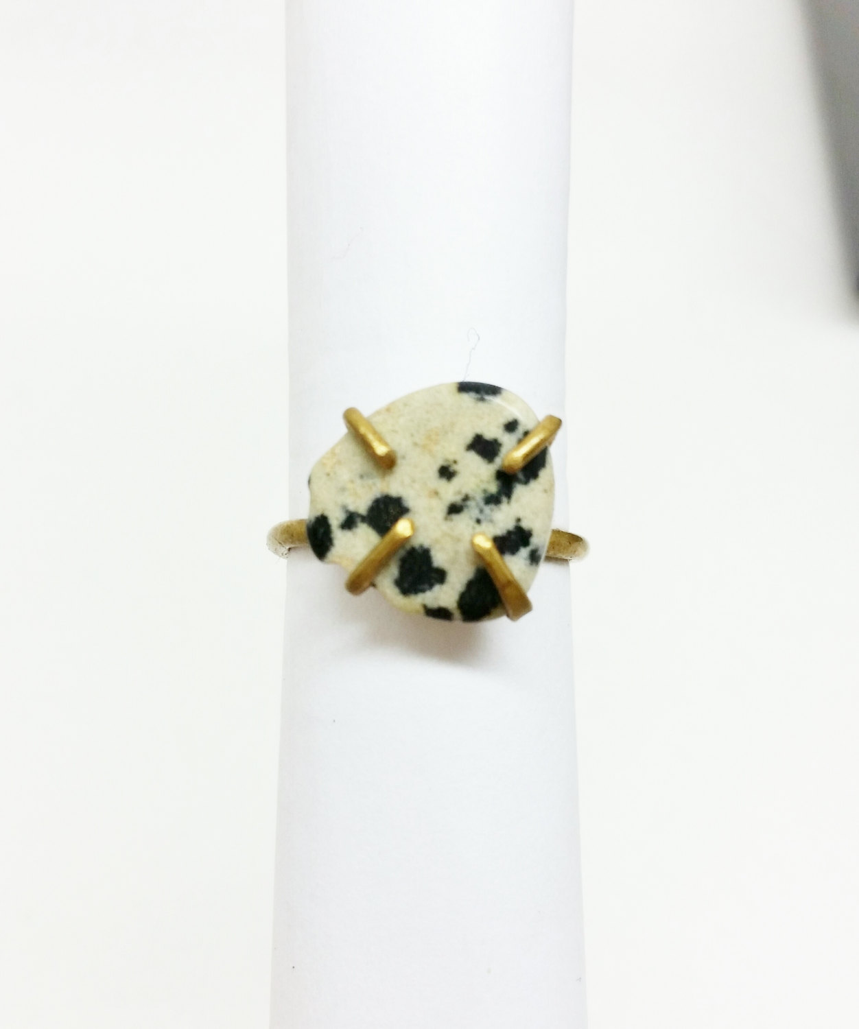 This brass ring was handcrafted with a beautiful dalmatian jasper specimen to be as unique as you are. The ring is a size 5 (US). I also have dalmatian jasper rings available in other sizes.