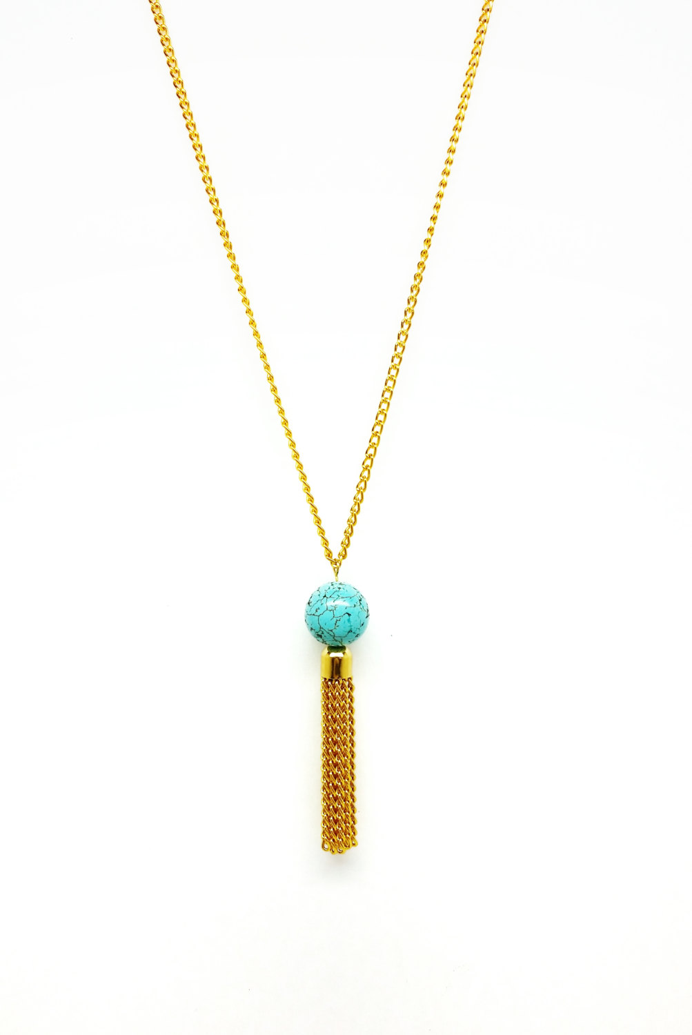 This beautiful tassel necklace features a large blue howlite bead (also available in white or black) and is available in either gold or silver. This necklace looks great on its own, and even better when paired with one of our matching minimal howlite necklaces. The tassel measures 1.5-2 inches long, and the bead is 16mm in diameter.