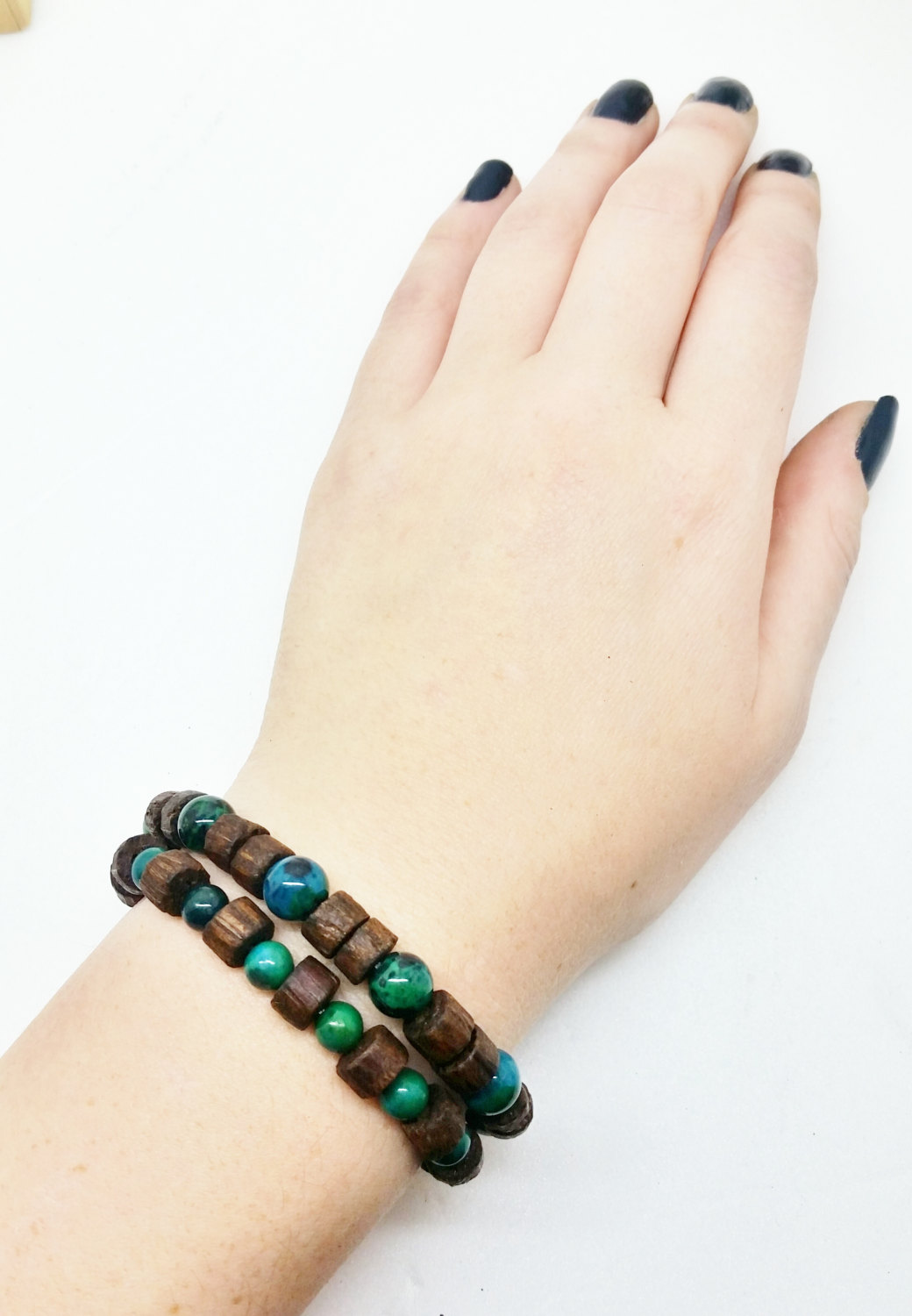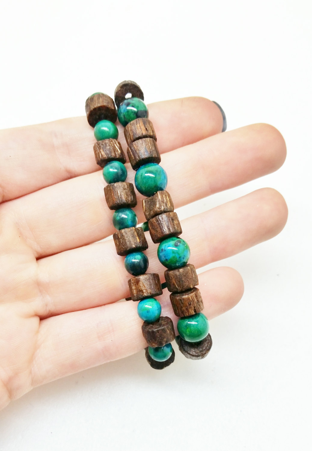 Chrysocolla Wood Yoga Bracelet Healing Energy Stretch Mala Unisex Bracelet
