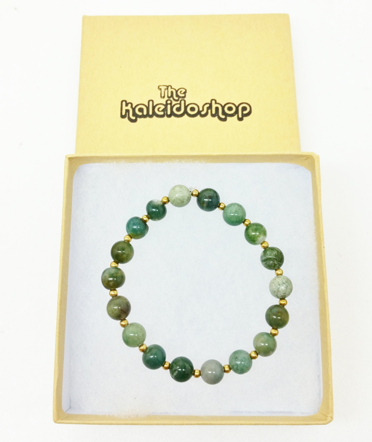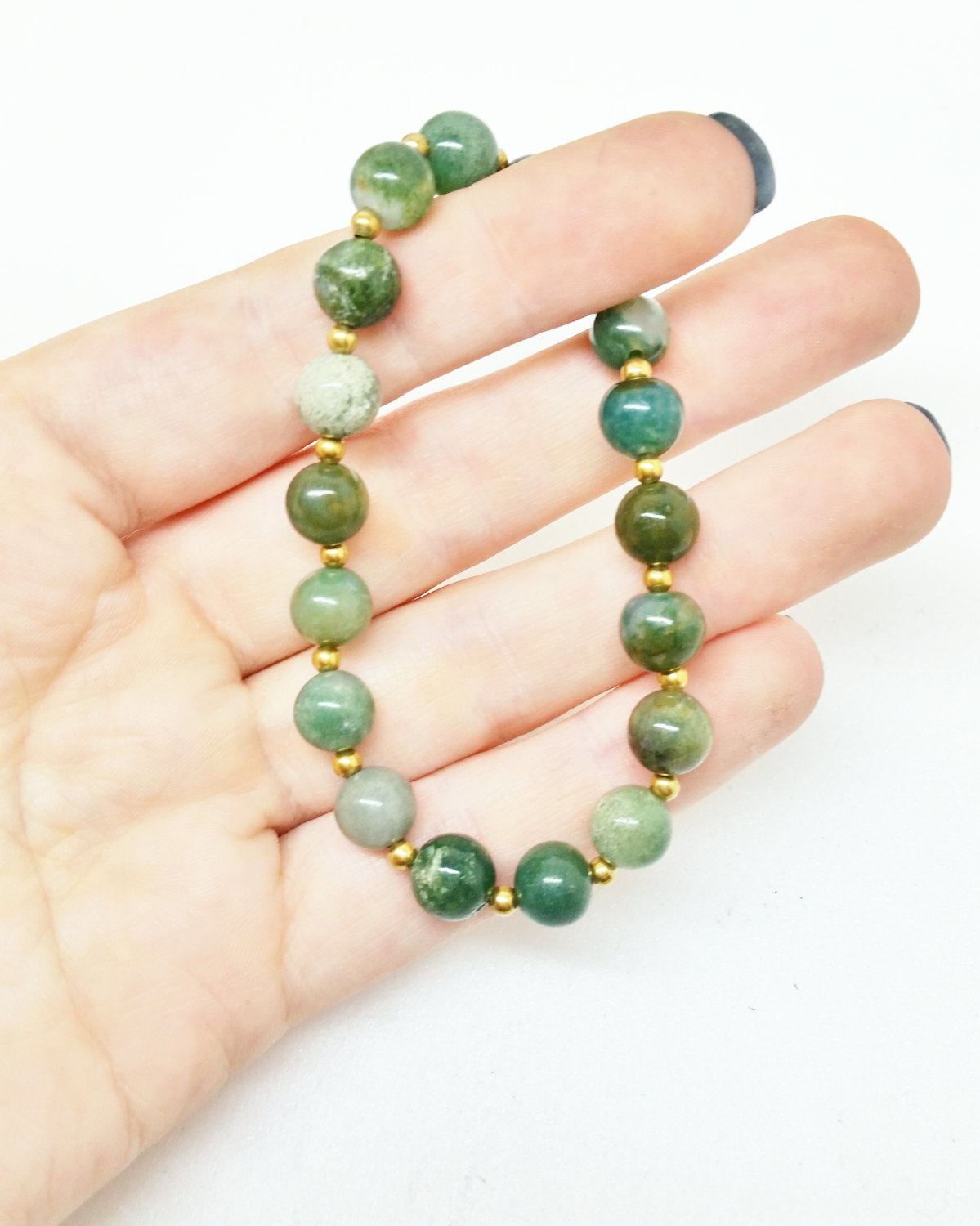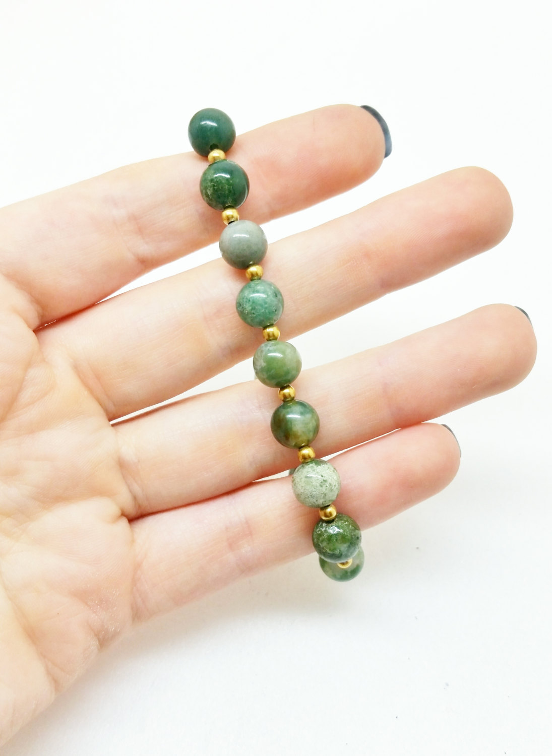 These bracelets are another personal favorite of mine. Made of natural 8mm and 6mm Green Indian Agate beads with brass spacer beads, these are great for anyone who loves classic color combinations like green and gold. Indian agate beads are all different shades because of all the natural differences in this stone. I love all the beautiful different green colors and how well they go with the brass spacer beads. The bracelets are made with durable stretch cord, which is double-threaded and very securely knotted (which is hidden inside a bead). Most of my customers prefer the small size for their bracelets, as it stays in place best. This bracelet is pictured in size small.