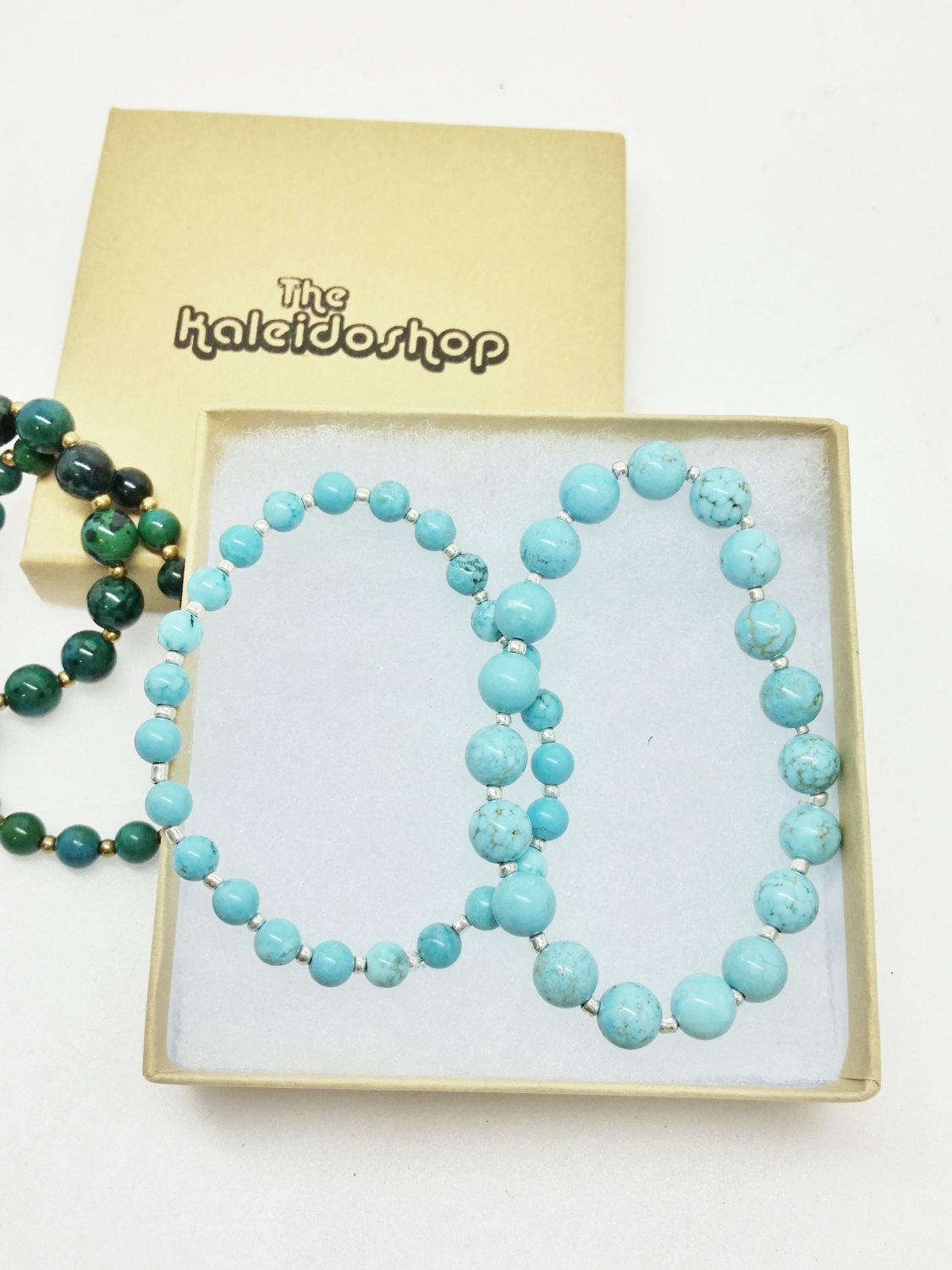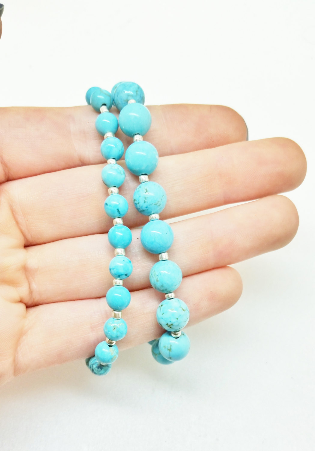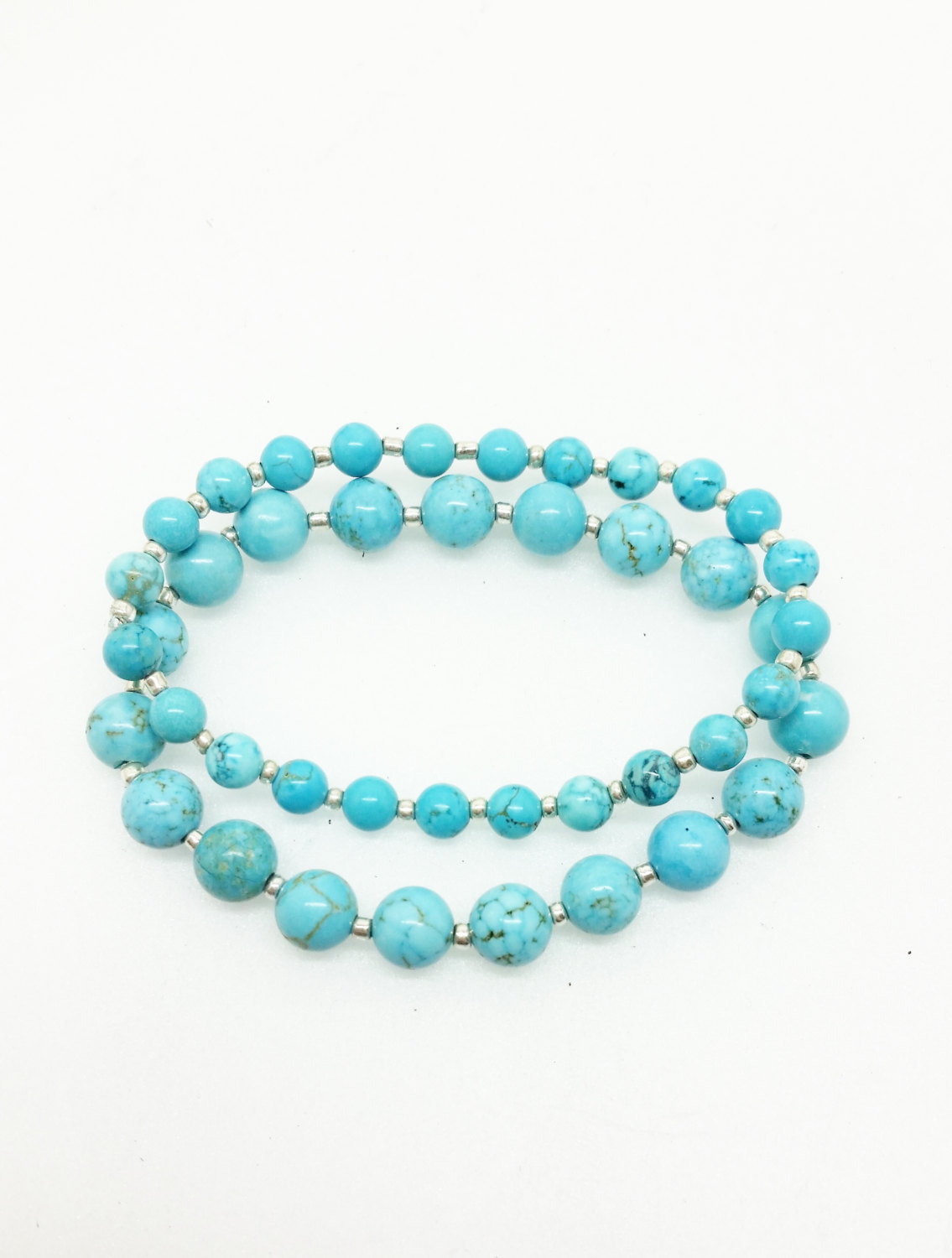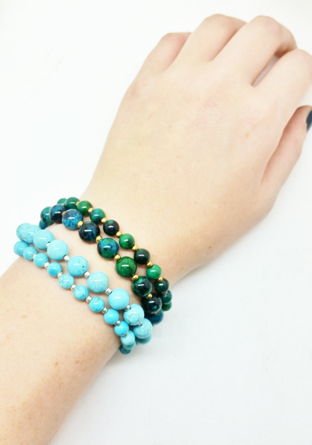 These blue howlite bracelets are bestsellers! Made of natural 8mm and 6mm howlite beads with silver spacer beads, these are great for anyone who loves turquoise. The bracelets are made with durable stretch cord, which is double-threaded and very securely knotted (which is hidden inside a bead). Most of my customers prefer the small size for their bracelets, as it stays in place best. This set is pictured with the Chrysocolla set, both in size small. Ordering these in a set saves you $5, and they come packaged in a gift box!