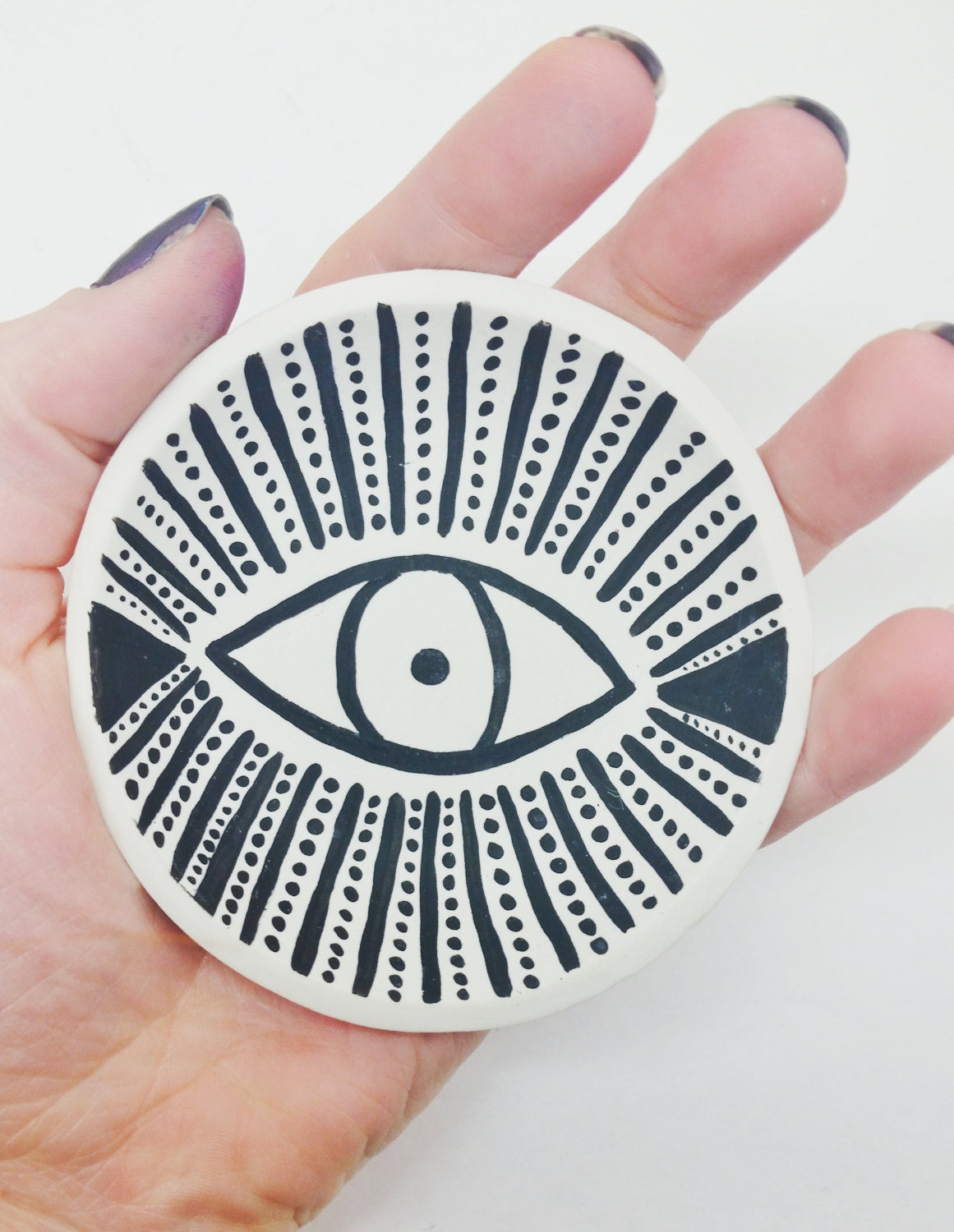 Let me guess, taking your jewelry off is often one of the last things you do at the end of the day, so sometimes you misplace your favorite earrings or ring? Or even worse, you take off your rings next to the sink, and then scramble to grab them when you inevitably knock one in? Yeah, me too. That's why I knew I needed to design lots of unique ring dishes so you can find the perfect one for your favorite jewelry. BONUS: These also make fabulous tealight holders! This small clay dish was hand painted with this evil eye pattern. Would look great among your crystal collection, to hold small jewelry, or just as decoration.