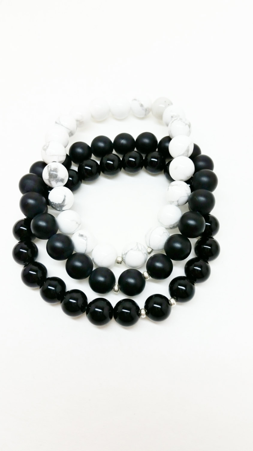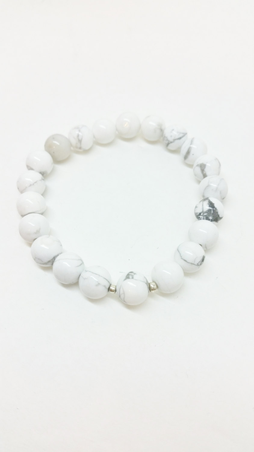 These simple white howlite bracelets are made with natural 8mm beads and 2 silver spacer accent beads. Their beautiful marble look makes them a great accent to any outfit, and makes them an easy choice for gift giving. The bracelets are made with durable stretch cord, which is double-threaded and very securely knotted (which is hidden inside a bead). Most of my customers prefer the small size for their bracelets, as it stays in place best. This set is pictured with the matte onyx and polished onyx bracelets, all in size small. Ordering the set of 3 for $39 saves $12, and they come in a gift box!